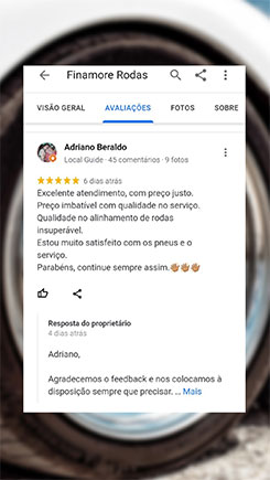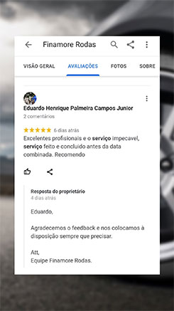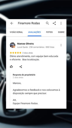 Ágil, eficiente e honesta, a Finamore Rodas tornou-se uma empresa de restauração e reparos em rodas respeitável e conhecida. Nossa equipe está preparada para qualquer serviço, desde a parte de rodas, freios, suspensão, troca de óleo, gerenciando produtos e serviços com a habilidade e experiência que nossos clientes esperam. Comercializamos rodas, pneus e acessórios para rodas oferecendo sempre a melhor qualidade aos nossos clientes.